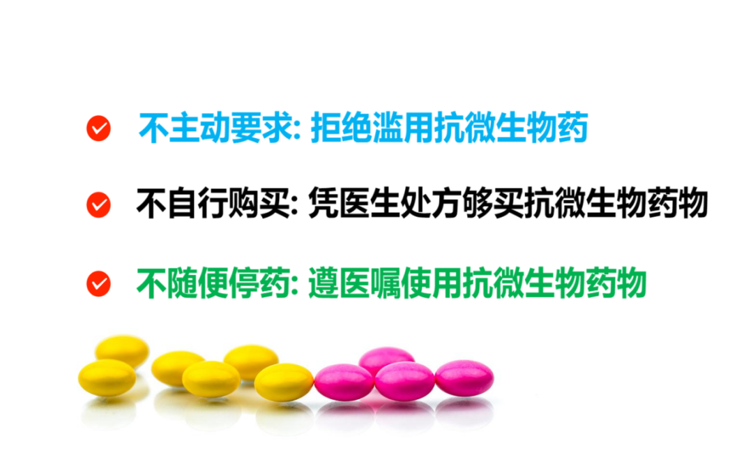 合理使用抗微生物药物关乎我们每一位公众的身体健康和生命安全,要改变公众传统的用药误区,提高认识是第一位,让每一位社会公众都能从自己做起,知行合一, 做自己健康的第一责任人,减缓抗微生物药物耐药的进程。保护人类子孙后代,我们仍然有很长的路要走。如果我们不采取行动,我们终将无药可用。今天,我们比任何时候都需要团结一致,与抗微生物药物耐药做斗争,为实现健康中国,全球同一个健康贡献一份力量!