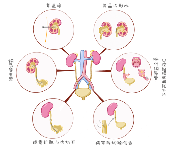 对于病情发展缓慢,积水程度轻,没有特殊症状,如慢性炎症水肿所致的肾积水,部分患者可以采用药物治疗,消炎解痉,达到治疗目的。此种情况需要遵从医嘱,定期复查。由输尿管梗阻导致的肾积水,治疗最基本原则是解除梗阻,恢复尿路的连续性及通畅性。治疗方式包括放置输尿管支架、肾造瘘、内镜下球囊扩张或内切开、输尿管切除吻合、肾盂成形术、输尿管膀胱再植术、膀胱瓣成形术和利用口腔黏膜/阑尾/小肠进行输尿管修复或重建等。不同治疗方式的选择主要取决于患者的意愿和梗阻的部位、长度,同时梗阻的病因、类型、患者的身体状态也是重要的参考依据。各种治疗方法的最终目的在于保护肾功能,提高生活质量。