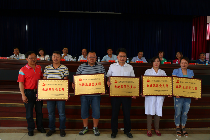 在喜迎党的十九大召开之际,为纪念中国共产党成立96周年,进一步增强各基层党组织的创造力、凝聚力和战斗力,激发全体职工干事创业、争创一流的积极性、主动性和创造性,7月28日下午,我院隆重召开2017年度“两优一先”:先进基层党组织、优秀共产党员、优秀党务工作者表彰大会。医院领导领导班子出席会议。全院党支部书记、主任、副书记、护士长以及受表彰的先进基层党组织代表、优秀共产党员、优秀党务工作者近300名参加会议。会议由医院党委钟红萍同志主持。