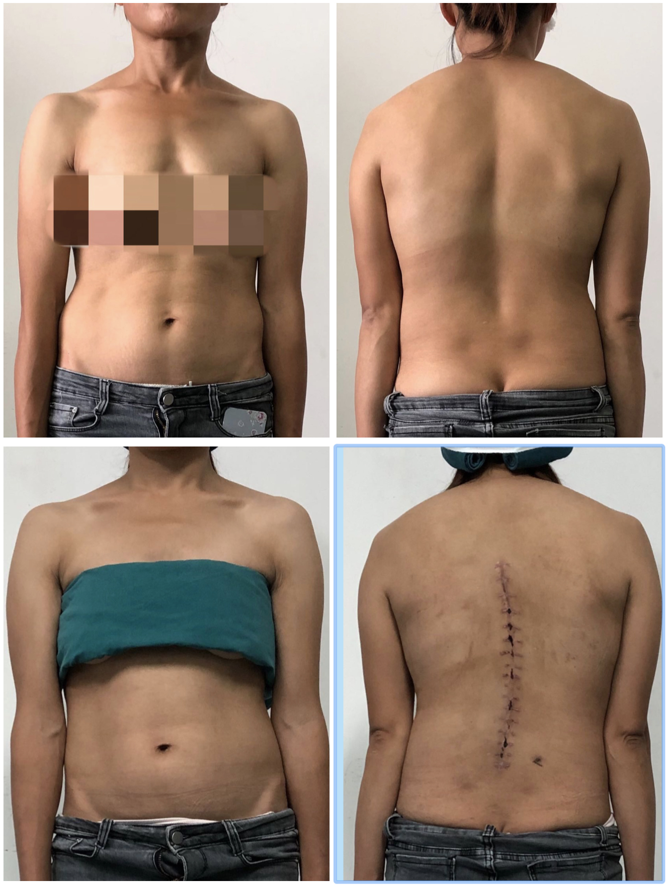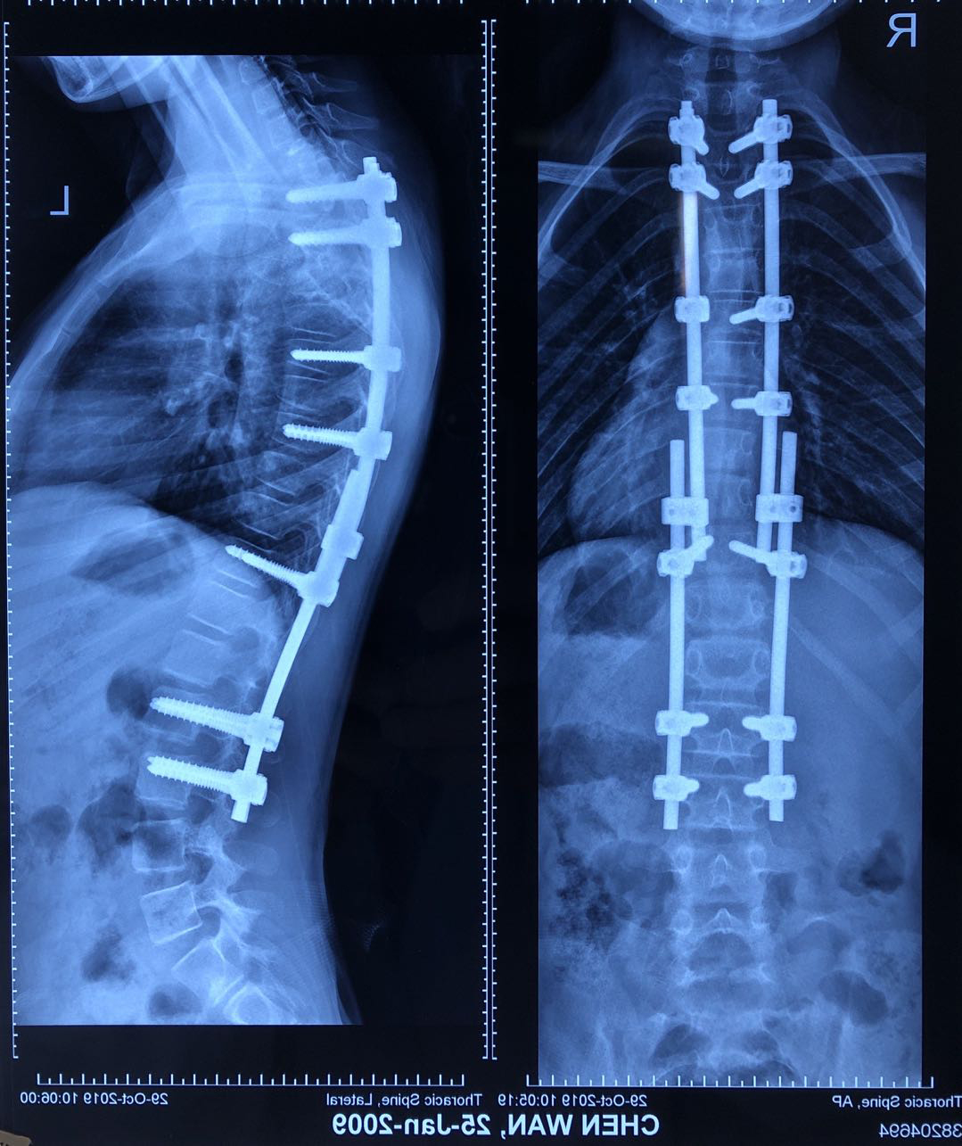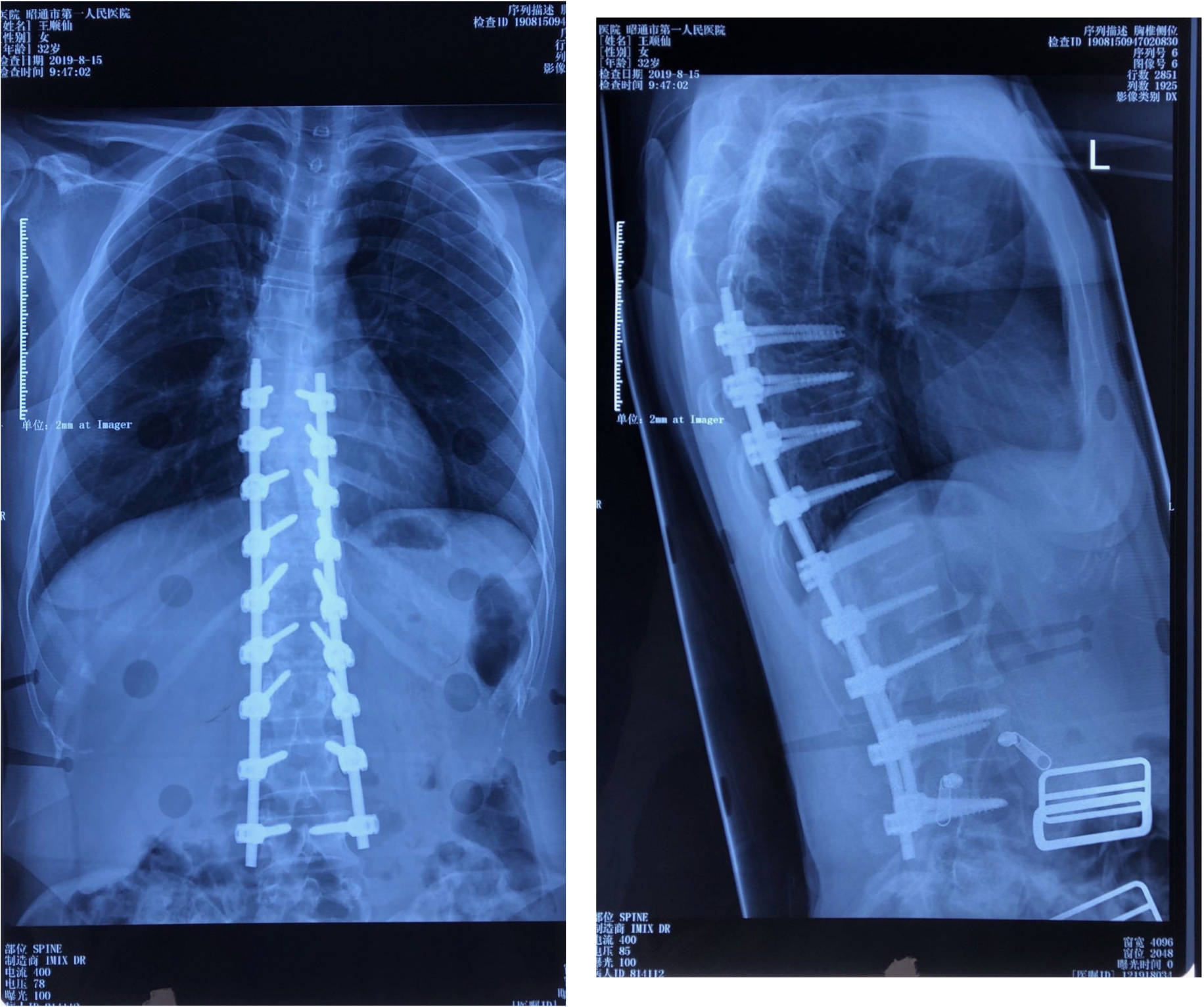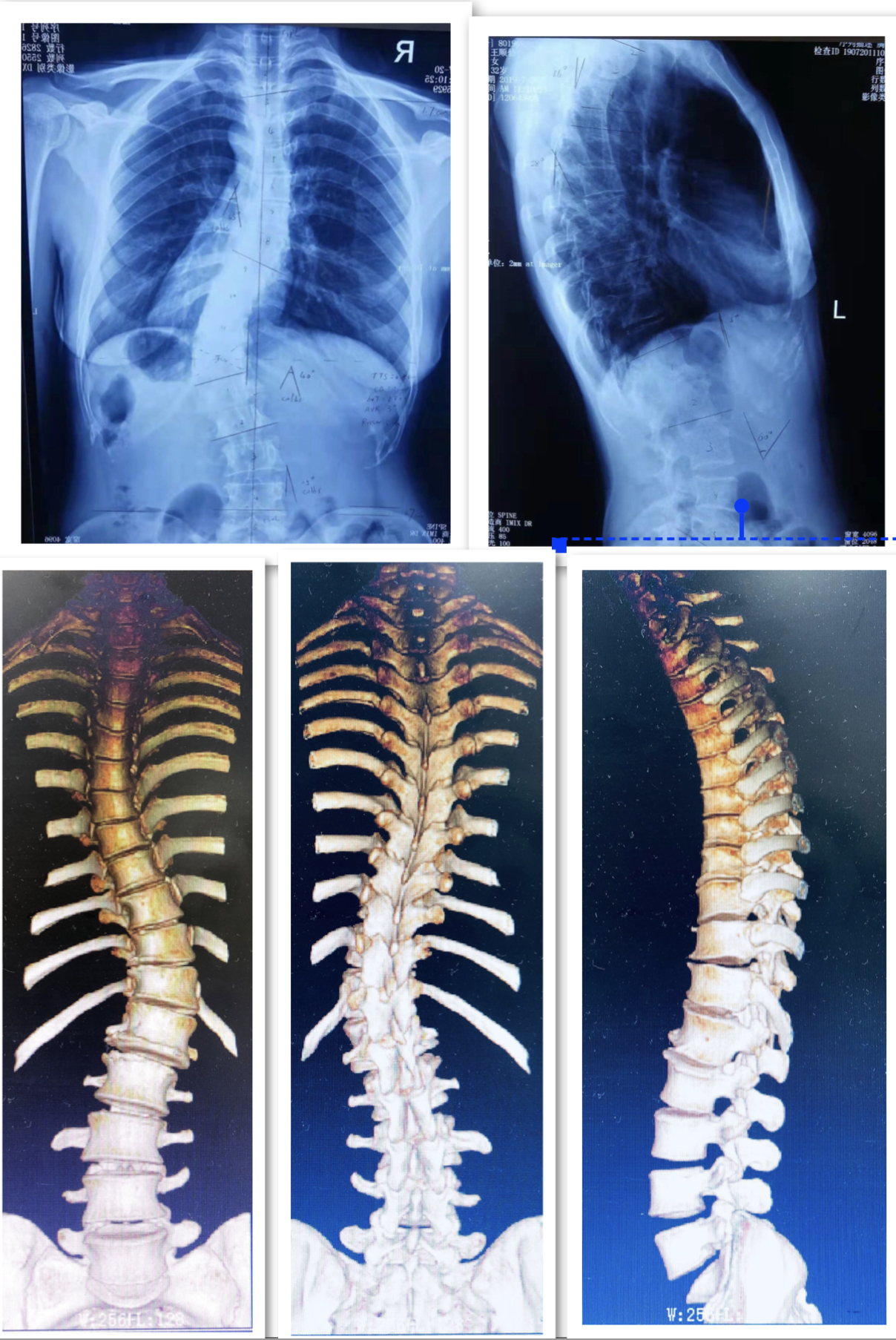 病例二:患者王某,女性,32岁,云南省昭阳区人,因“发现胸腰背部侧弯畸形伴疼痛半年余”入院,诊断为:脊柱侧凸畸形并功能障碍。行脊柱侧凸畸形并功能障碍经后路胸腰椎截骨矫形钉棒系统内固定融合术。