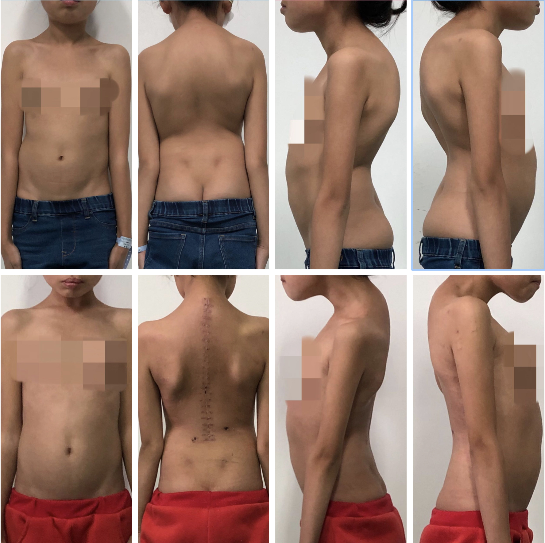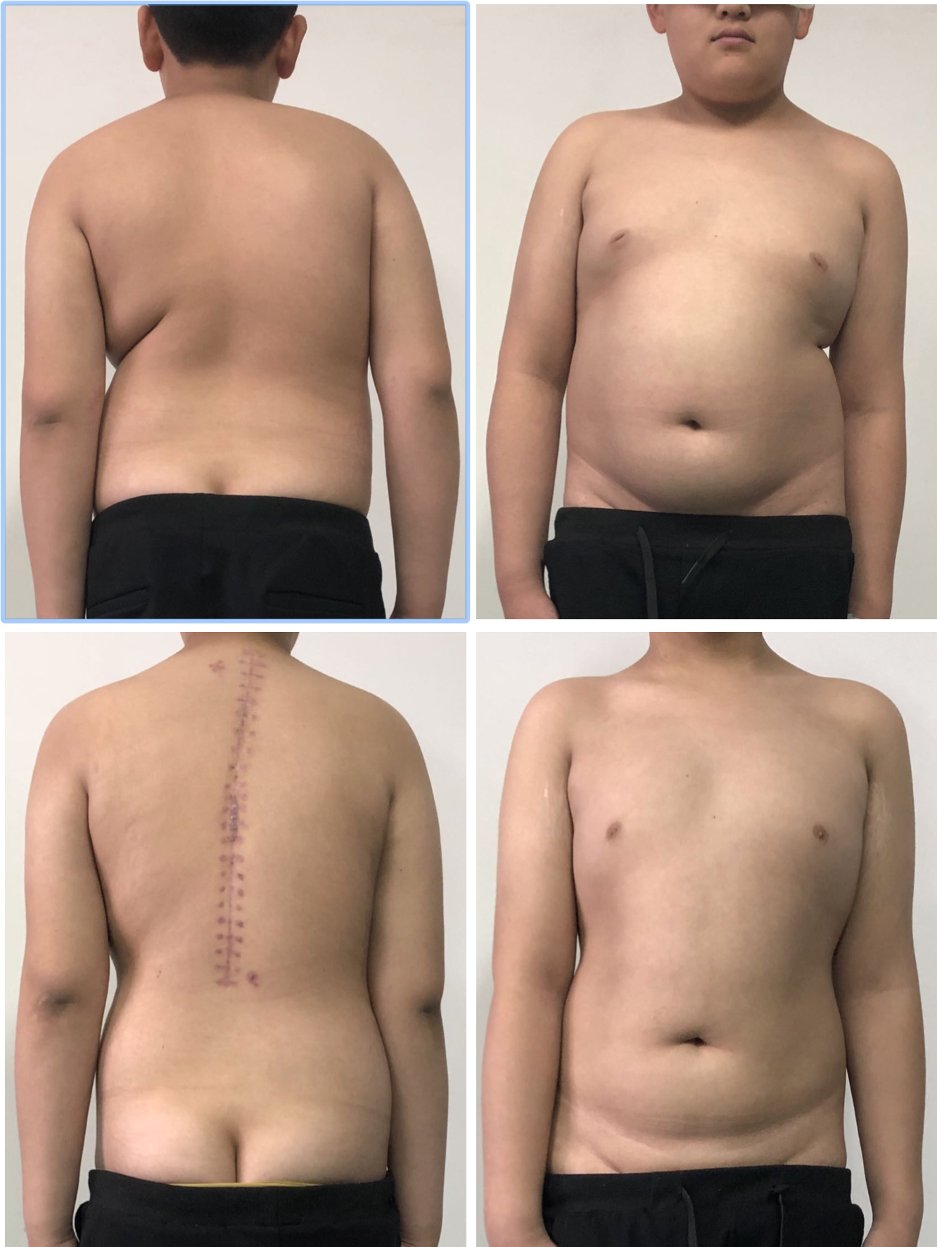 病例五:患者陈某,男性,10岁8月,云南省威信县人,因“发现胸背部畸形3年余”入院,诊断为:脊柱侧后凸畸形并功能障碍(休门氏病),行经后路胸椎SPO截骨矫形生长棒内固定术。