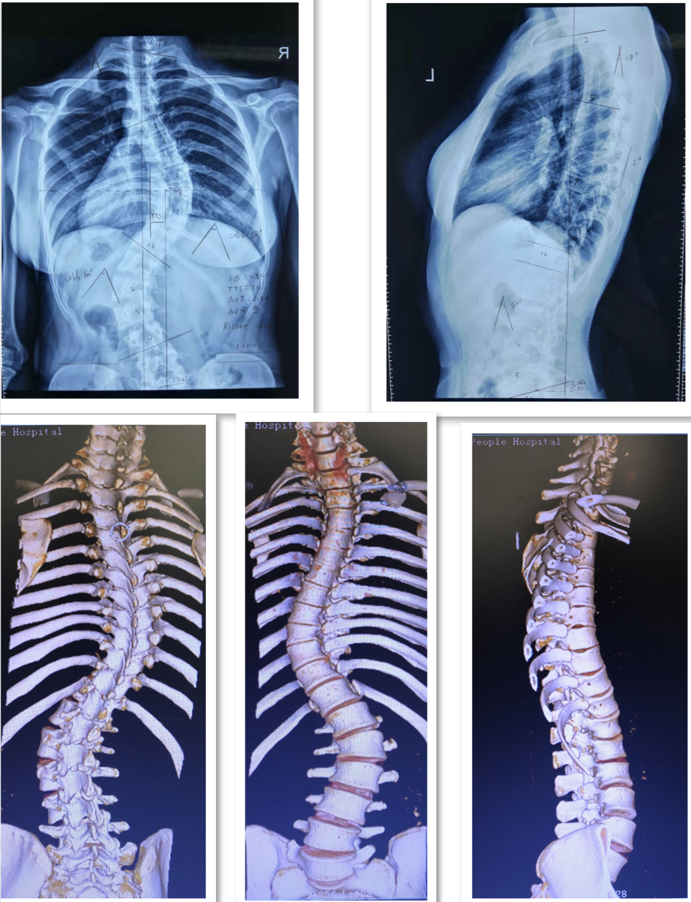病例一:患者马某,男性,16岁,贵州省威宁县人,因“发现胸腰背部畸形3月余”入院,诊断为:脊柱侧后凸畸形并功能障碍,行经后路胸椎SPO截骨矫形钉棒系统内固定融合术。
