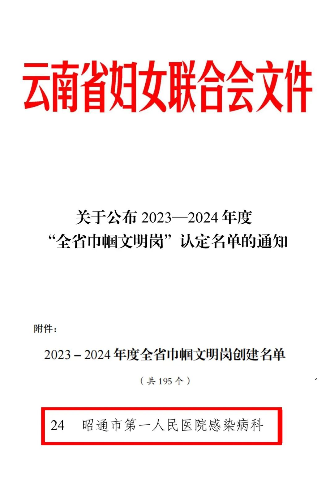为进一步激发云南广大妇女建功新时代的热情和动力,引领妇女同胞在参与新时代中国特色社会主义伟大实践中实现自身进步与发展,近日,云南省妇联印发《关于公布 2023—2024 年度 “全省巾帼文明岗”认定名单的通知》,昭通市第一人民医院感染病科光荣上榜,获“全省巾帼文明岗”殊荣。
