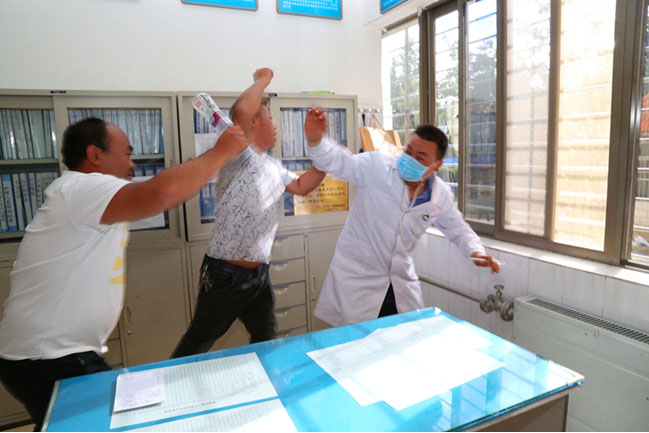演练从急诊科清创室开始。清创室病人较多,大家依次排队等候看诊,一名男子因不满候诊时间过长,突然情绪激动,开始大声辱骂、推搡主诊医生,而后其陪诊人员也对主诊医生拳脚相向,同时还用桌上的器械敲打医生头部,对医护人员进行“施暴”,当班的其他医护人员立即拨打了我院保卫处值班室电话。保卫处接警后迅速赶到现场并拨打“110”报警,急诊科附近执勤人员也快速赶赴现场,执勤人员一边对“施暴者”进行劝阻和安抚,一边找准时机迅速夺下“施暴者”手中的器械;一边组织人员对受伤人员进行救治,并安排人员维护好现场秩序,拉起警戒线保留现场,严禁无关人员进入,并通知监控中心收集完善好影像资料,密切关注。最终,在保卫处队员的全力配合下成功制服了“施暴者”,并将其移送公安机关处理,受伤医务人员也在第一时间得到了及时的救治。