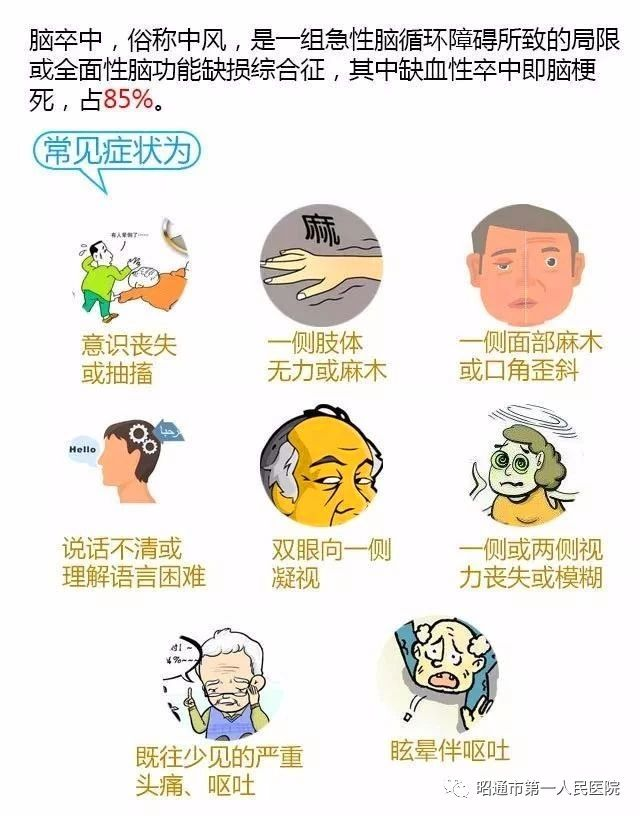 “脑卒中”(cerebral stroke)又称“中风”、“脑血管意外”(cerebralvascular accident,CVA)。是一种急性脑血管疾病,是由于脑部血管突然破裂或因血管阻塞导致血液不能流入大脑而引起脑组织损伤的一组疾病,包括缺血性和出血性卒中。缺血性卒中的发病率高于出血性卒中,占脑卒中总数的60%~70%。颈内动脉和椎动脉闭塞和狭窄可引起缺血性脑卒中,年龄多在40岁以上,男性较女性多,严重者可引起死亡。出血性卒中的死亡率较高。调查显示,城乡合计脑卒中已成为我国第一位死亡原因,也是中国成年人残疾的首要原因,脑卒中具有发病率高、死亡率高和致残率高的特点。不同类型的脑卒中,其治疗方式不同。由于一直缺乏有效的治疗手段,目前认为预防是最好的措施,其中高血压是导致脑卒中的重要可控危险因素,因此,降压治疗对预防卒中发病和复发尤为重要。应加强对全民普及脑卒中危险因素及先兆症状的教育,才能真正防治脑卒中。