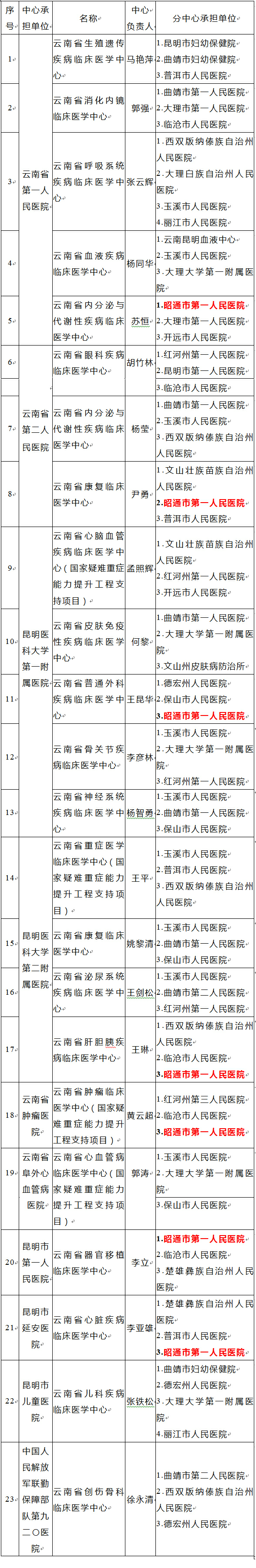 为贯彻落实《中共云南省委云南省人民政府关于进一步加快卫生与健康事业改革发展的决定》(云发〔2016〕38号)“建设50个具有云南特色优势的省级临床重点学科”精神,着力打造云南临床医学制高点,提升省、州市级医院医教研能力水平,带动全省整体疾病防治水平的提高。根据《云南省临床医学中心(云南省临床重点学科)建设实施方案》要求,云南省卫生健康委组织完成了2018年云南省临床医学中心(云南省临床重点学科)的遴选评审等工作,现发布认定的23个云南省临床医学中心(云南省临床重点学科)和71个分中心建设单位名单。